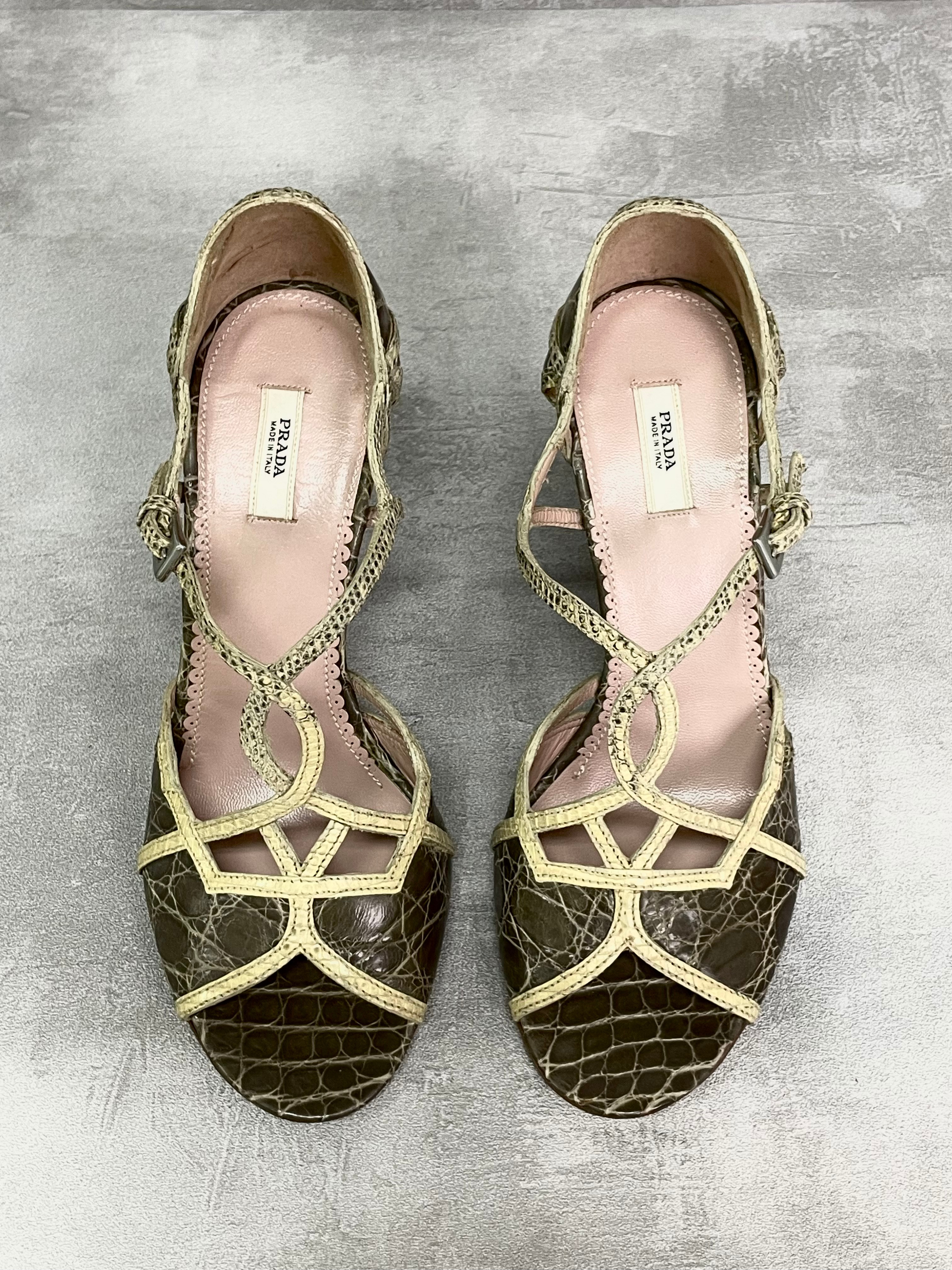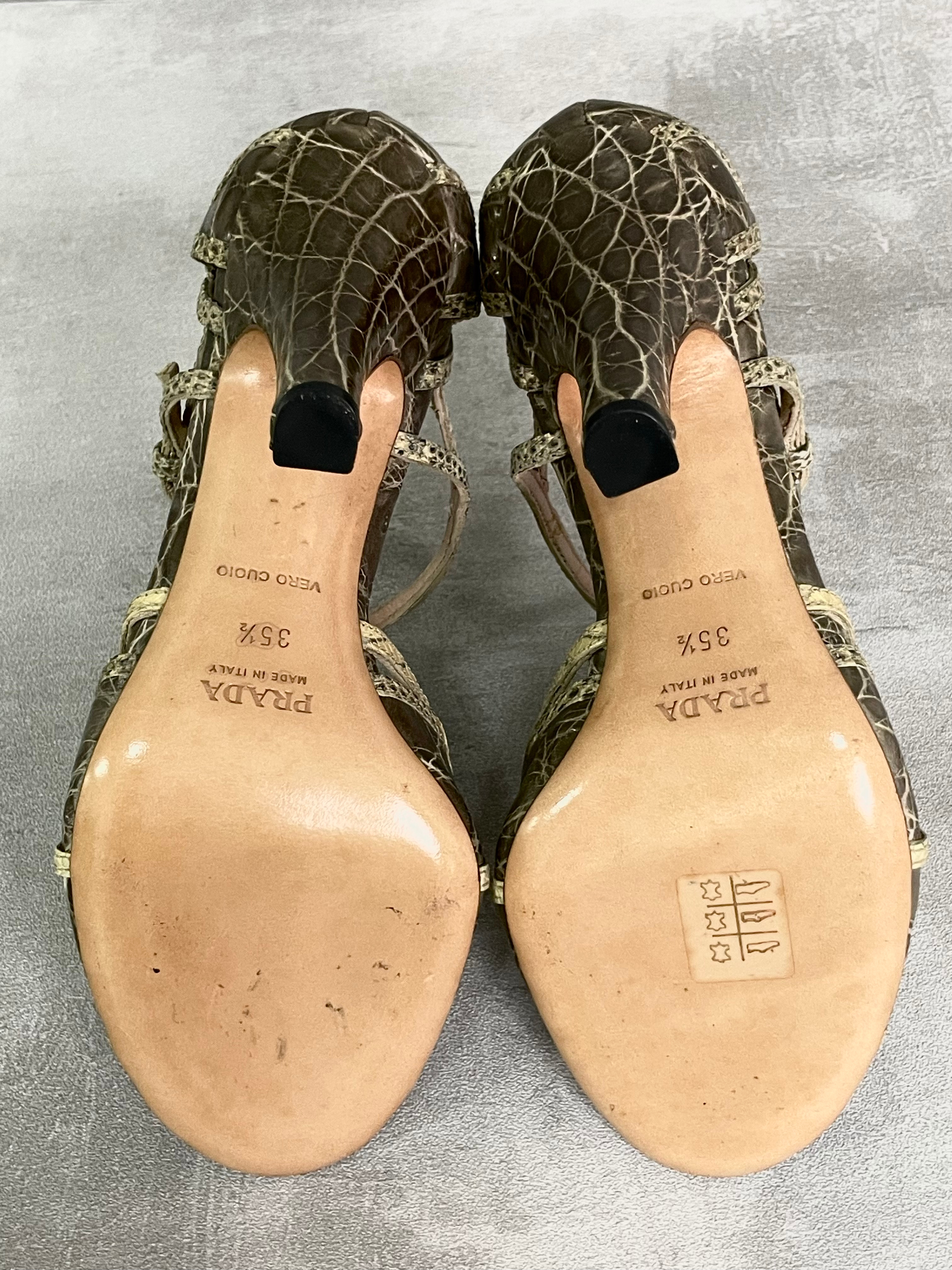 Prada Brown 95mm Open Toe High Heels With Beige Straps