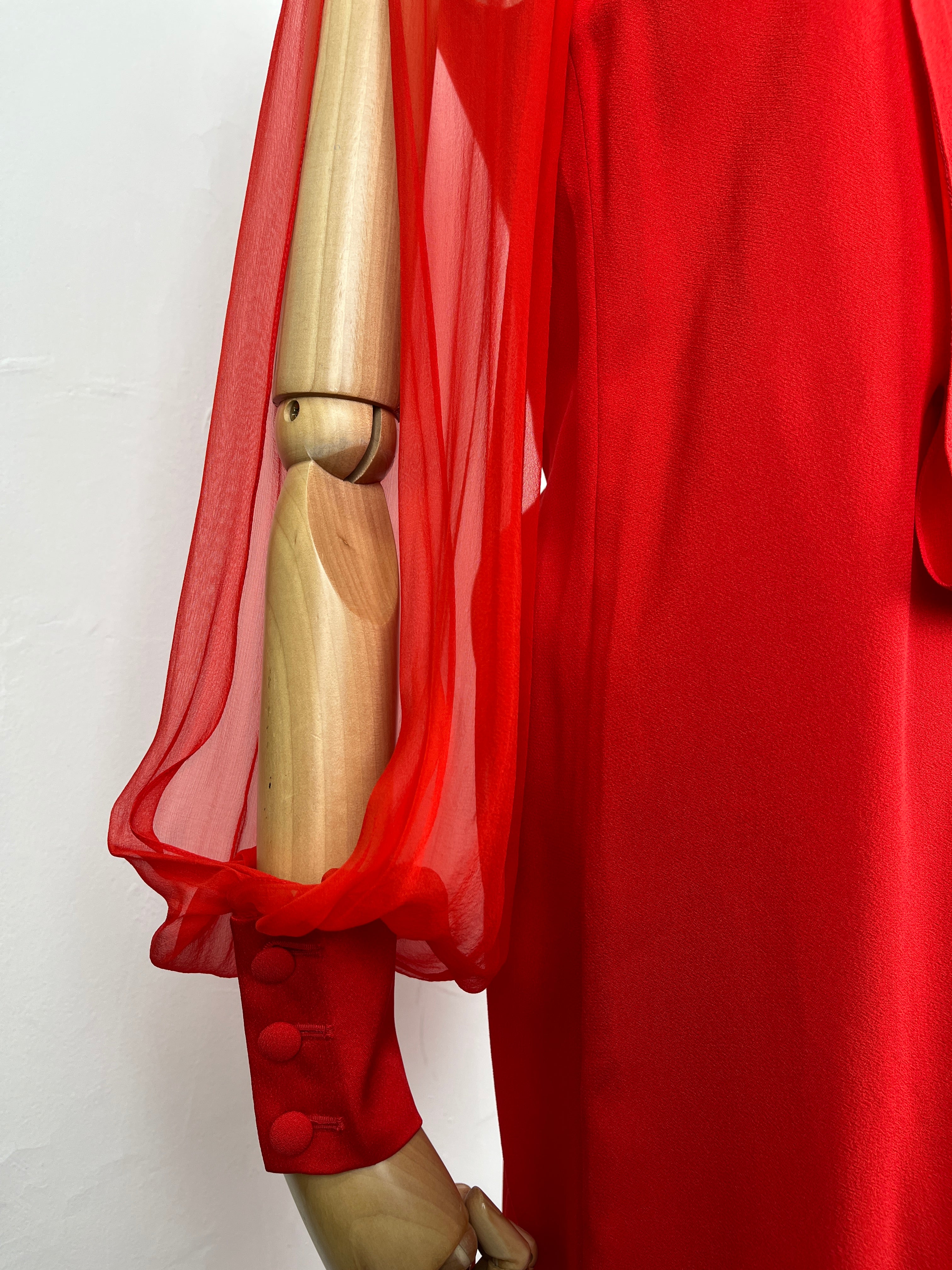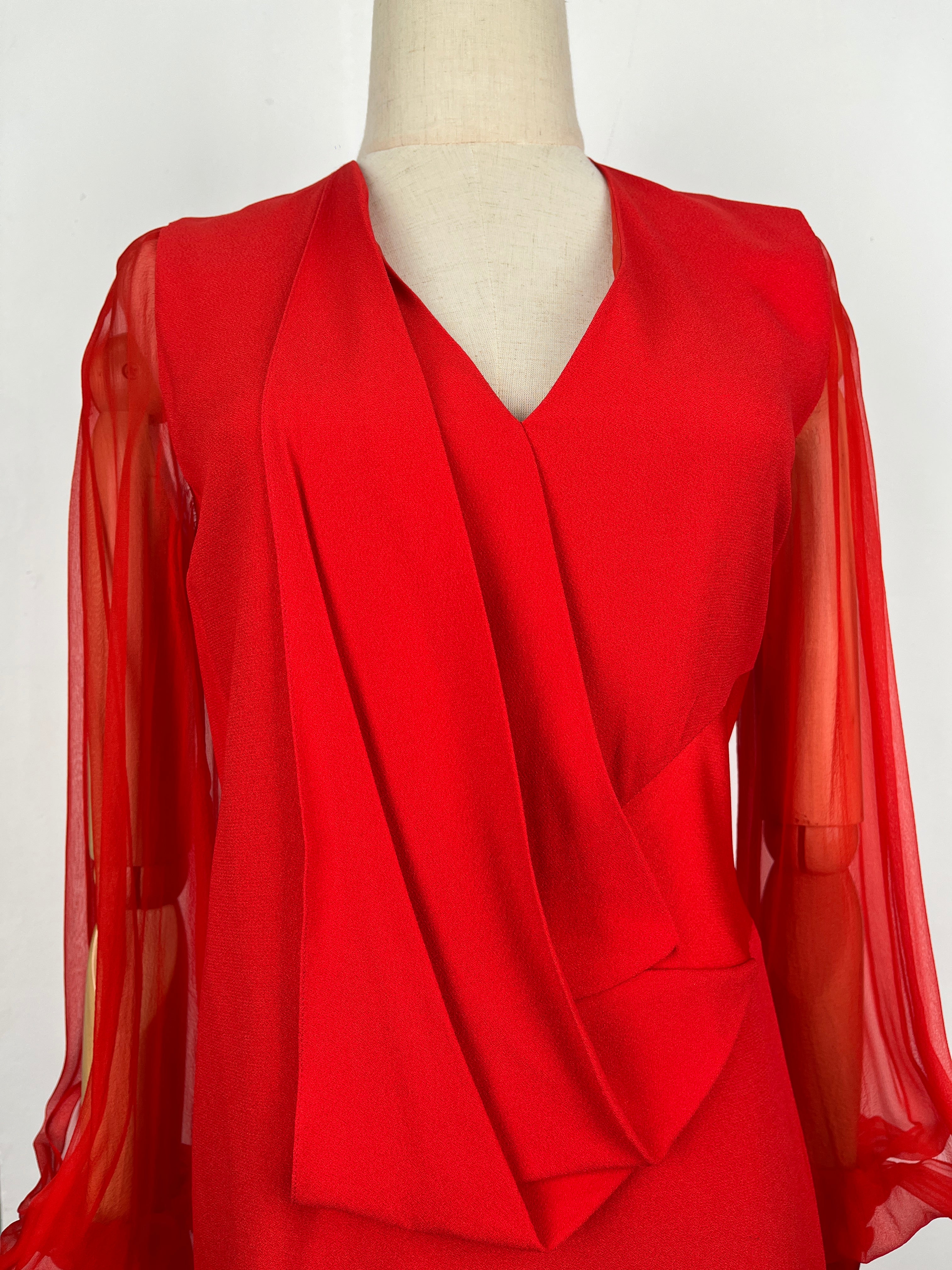 Red Sheer And Open Long Sleeves Draped Long Dress