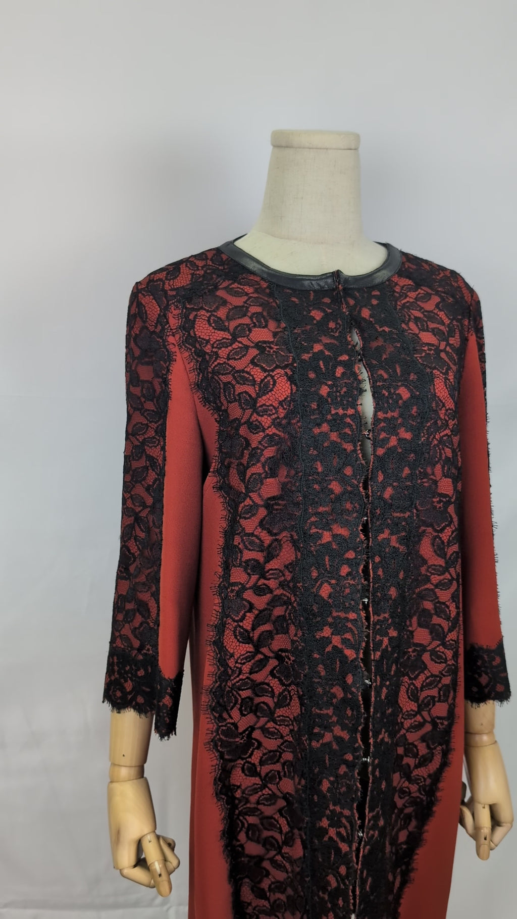 Andrew GN Wine Red Knee Length Thin Dinner Jacket With Black Lace Details